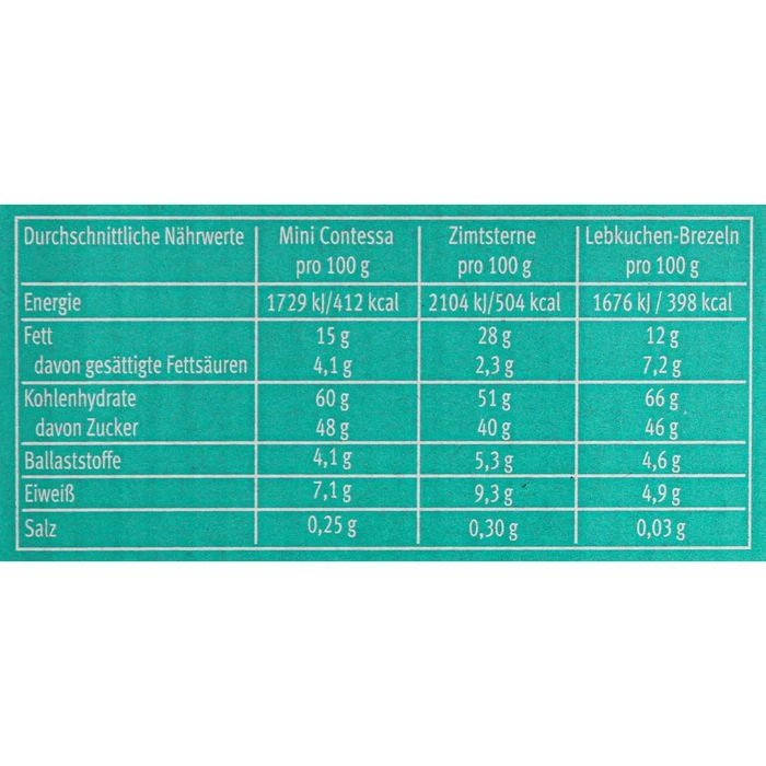 Zutaten: Mini Contessa – Zucker, gemahlene Aprikosenkerne, WEIZENMEHL, Glukose-Fruktose-Sirup, Kakaomasse, Stabilisator: Sorbit; Karamellzuckersirup, Orangenschalen, Invertzuckersirup, Kakaobutter, HÜHNEREIKLARPULVER, Zimt, Backtriebmittel: Diphosphate, Natriumcarbonate; Gewürze, Molkenerzeugnis (MILCH), Stärke (WEIZEN), Emulgator: Lecithine; Säuerungsmittel: Citronensäure; Aroma.
