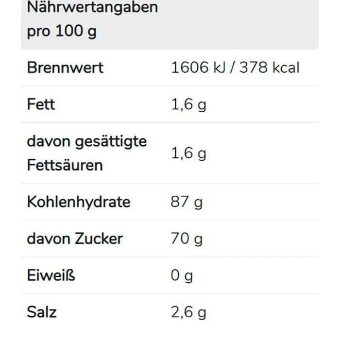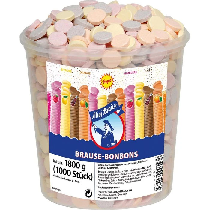 Zutaten: Zucker, Maltodextrin, Säuerungsmittel: L(+)- Weinsäure und Citronensäure, Säureregulator: Natriumhydrogencarbonat, pflanzliche Fette (Raps) ganz gehärtet, Glukosesirup, Stärke, Aromen, Trennmittel: Mono- und Diglyceride von Speisefettsäuren, Farbstoffe: Kurkumin, echtes Karmin und Paprikaextrakt, Saflorkonzentrat