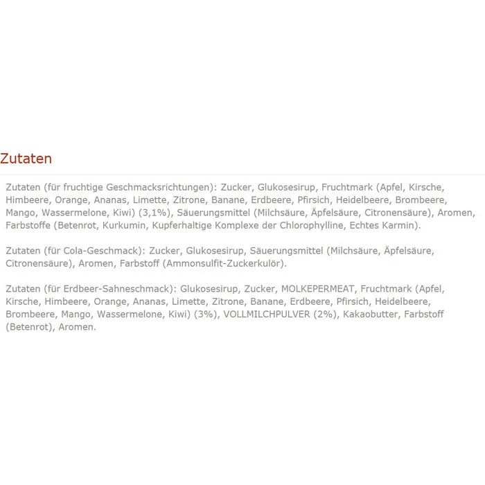 Für fruchtige Geschmacksrichtungen: Zucker, Glukosesirup, Fruchtmark (Apfel, Kirsche, Himbeere, Orange, Ananas, Limette, Zitrone, Banane, Erdbeere, Pfirsich, Heidelbeere, Brombeere, Mango, Wassermelone, Kiwi) (3,1%), Säuerungsmittel (Milchsäure, Äpfelsäure, Citronensäure), Aromen, Farbstoffe (Betenrot, Kurkumin, Kupferhaltige Komplexe der Chlorophylline, Echtes Karmin).