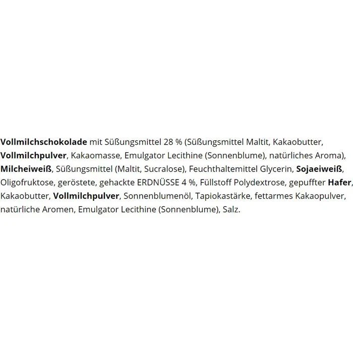 Zutaten: VOLLMILCHSCHOKOLADE mit Süßungsmittel 28 % (Süßungsmittel Maltit, Kakaobutter, VOLLMILCHPULVER, Kakaomasse, Emulgator Lecithine (Sonnenblume), natürliches Aroma), MILCHEIWEIß, Süßungsmittel (Maltit, Sucralose), Feuchthaltemittel Glycerin, SOJAEIWEIß, Oligofruktose, geröstete, gehackte ERDNÜSSE 4 %, Füllstoff Polydextrose, gepuffter HAFER, Kakaobutter, VOLLMILCHPULVER, Sonnenblumenöl, Tapiokastärke, fettarmes Kakaopulver, natürliche Aromen, Emulgator Lecithine (Sonnenblume), Salz.