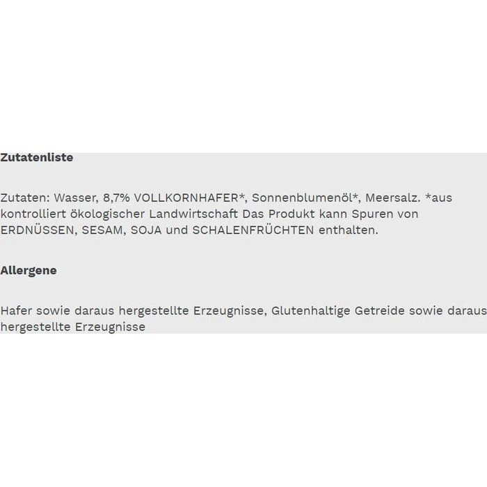 Zutaten: Wasser, 5% VOLLKORNHAFER**, Sonnenblumenöl**, Meersalz, Stabilisator: Guarkernmehl**