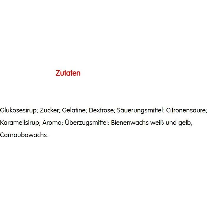 Glukosesirup, Zucker, Gelatine, Dextrose, Säuerungsmittel: Citronensäure, Karamellsirup, Aroma, Überzugsmittel: Bienenwachs weiß und gelb, Carnaubawachs