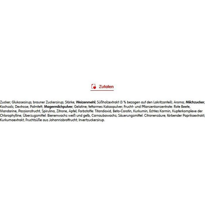Zutaten: Glukosesirup; brauner Zuckersirup; Zucker; WEIZENMEHL; Stärke; Süßholzextrakt (3 % bezogen auf den Lakritzanteil); Aroma; Kochsalz; MILCHZUCKER; Dextrose; Kokosraspeln; MAGERMILCHPULVER; Palmfett; Säuerungsmittel: Citronensäure; Gelatine; Frucht- und Pflanzenkonzentrate: Saflor, Apfel, Karotte, Rote Beete, Paprika, Zitrone, Spirulina, Hibiskus, Tomate, Kürbis, Holunderbeere, Orange, Schwarze Johannisbeere, Mango, Passionsfrucht, Aronia, Traube; Farbstoff: Titandioxid; Überzugsmittel: Bienenwachs weiß und gelb, Carnaubawachs; Holunderbeerextrakt; Karamellsirup; Invertzuckersirup