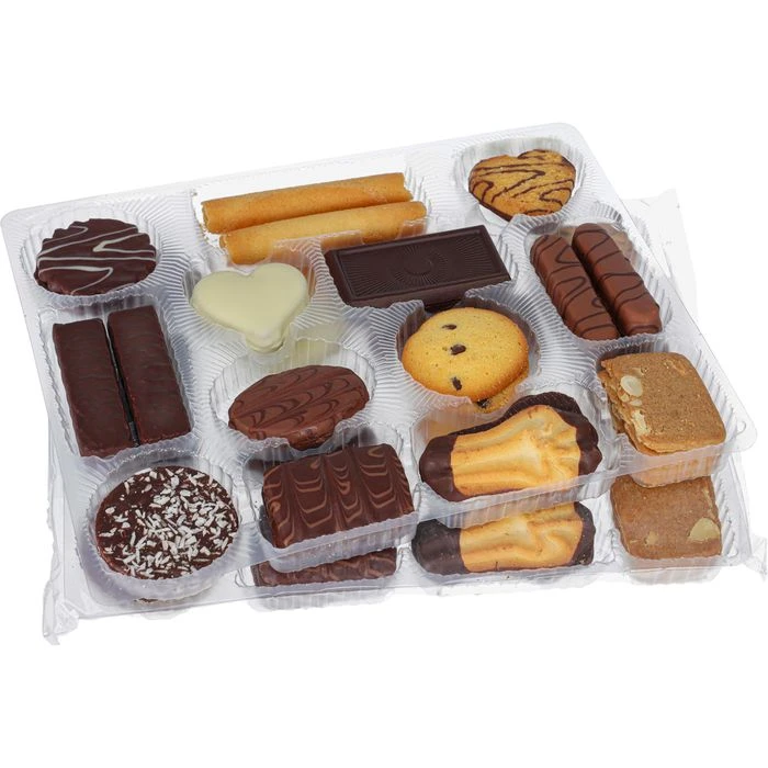Zutaten: WEIZENMEHL, Zucker, pflanzliche Fette (Palm, Kokos), Kakaomasse, Kakaobutter, Farinzucker, BUTTERREINFETT, VOLLMILCHPULVER, SÜßMOLKENPULVER, MAGERMILCHPULVER, WEIZENSTÄRKE, fettarmes Kakaopulver, flüssiges HÜHNEREIEIWEIß, Invertzuckersirup, Dextrose, MANDELN, Emulgatoren: Lecithine (SOJA), Mono- und Diglyceride von Speisefettsäuren; Kokosraspeln, Glukosesirup, Glukose-Fruktose-Sirup, MILCHZUCKER, Salz, Backtriebmittel: Natriumcarbonate, Diphosphate, Ammoniumcarbonate; natürliches Aroma, VOLLEIPULVER, Rapsöl, MILCHEIWEIß, HÜHNERTROCKENEIEIWEIß, flüssiges HÜHNEREIEIGELB, Karamellzuckersirup, Gewürze, GERSTENMALTEXTRAKT, Vanilleextrakt, Farbstoff: Beta-Carotin, Ammoniumsulfit-Zuckerkulör.
