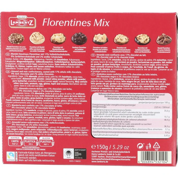 Zutaten: Zucker, 23% MANDELN, Glukosesirup, Palmfett, 6% HASELNÜSSE, Kakaomasse, Kakaobutter, MAGERMILCHPULVER, SÜßMOLKENPULVER, VOLLMILCHPULVER, BUTTERREINFETT, Emulgator: Lecithine (enthält SOJA); natürliches Aroma.