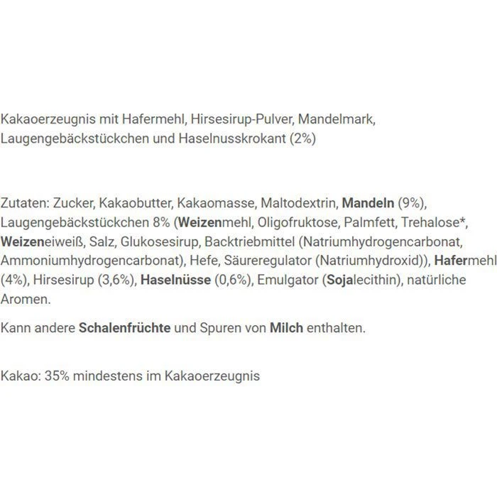 Zutaten: Zucker, HAFERDRINKPULVER (HAFERSIRUP (70%), Maltodextrin), Kakaobutter, Kakaomasse, MANDELN, Laugengebäckstückchen (WEIZENMEHL, Oligofruktose, Palmfett, Trehalose*, WEIZENEIWEIß, Salz, Glukosesirup, Backtriebmittel (Natriumhydrogencarbonat, Ammoniumhydrogencarbonat), Hefe, Säureregulator (Natriumhydroxid)), HASELNÜSSE, Emulgator (SOJALECITHIN), natürliche Aromen.