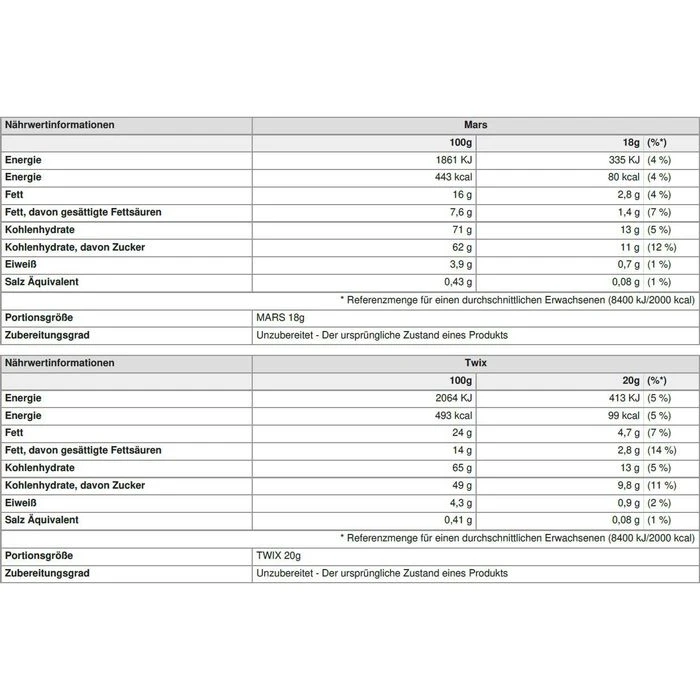 TWIX – Zucker, Glukosesirup, WEIZENMEHL (17%), Palmfett, Kakaobutter, MAGERMILCHPULVER, Kakaomasse, MILCHZUCKER, Butterreinfett (aus MILCH), Süssmolkenpulver (aus MILCH), fettarmer Kakao, Salz, Emulgator (SOJALECITHIN), Backtriebmittel (E500), natürlicher Vanilleextrakt.