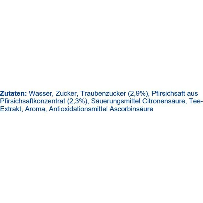 Zutaten:Wasser, Zucker, Traubenzucker (2,9%),Pfirsichsaft aus Pfirsichsaftkonzentrat (2,3%), Säuerungsmittel Citronensäure, Tee-Extrakt, Aroma, Antioxidationsmittel Ascorbinsäure