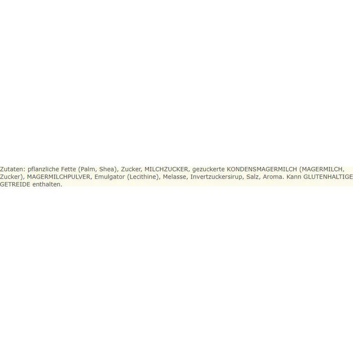 Zutaten: Pflanzliche Fette (Palm, Shea), Zucker, MILCHZUCKER, gezuckerte KONDENSMAGERMILCH (MAGERMILCH, Zucker), MAGERMILCHPULVER, Emulgator (Lecithine), Melasse, Invertzuckersirup, Salz, Aroma.
