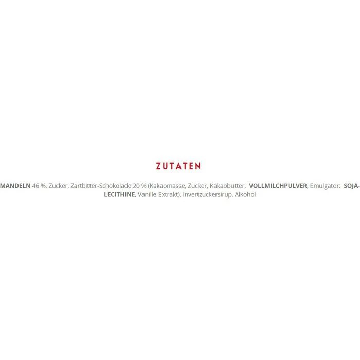 Zutaten: MANDELN 46%, Zucker, Zartbitter-Schokolade 20% (Kakaomasse, Zucker, Kakaobutter, VOLLMILCHPULVER, Emulgator: SOJA-LECITHINE, Vanille-Extrakt), Invertzuckersirup, Alkohol.