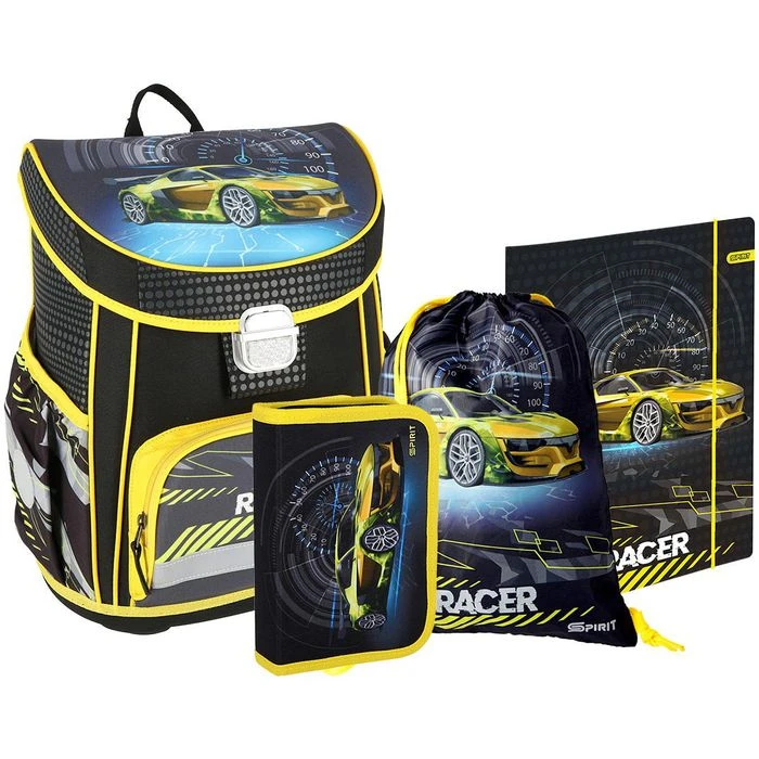 Lieferung: inkl. motivpassendem Schüleretui (gefüllt mit Fasermaler, Bunt- und Bleistifte, Anspitzer, Radiergummi und Lineal), Sportbeutel & Einschlagmappe (A4) mit Gummiband